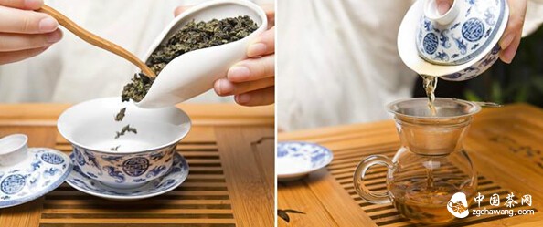 乌龙茶的种类、类别非常多,但还是可以按照外形大致分为条形乌龙和球形乌龙,条形乌龙的投茶量差不多占盖碗容量的1/5到1/3,球形乌龙则盖过盖碗底部就可以了。