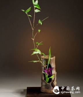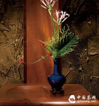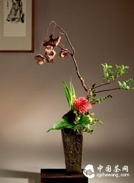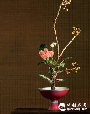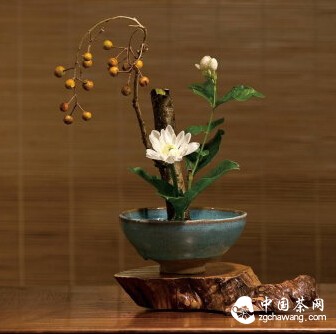 茶室插花继承中国传统插花的特点,注重自然情境,着力表现花材自然的形式美和色彩美,具有很强的季节感。作品中的技叶花果,顺其自然之势,曲直、仰俯、巧妙配合,宛若天成。