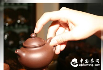 先用中指与母指夹于把壶顶,再用无名指顶卡壶把之后,再屈曲食指按于壶钮即可。
