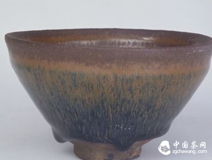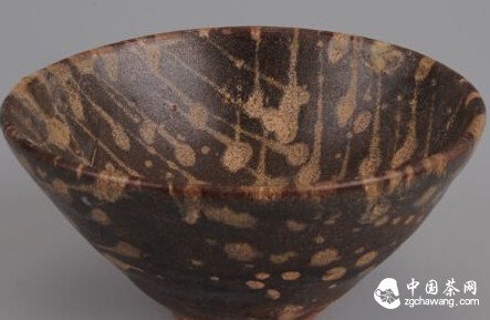 口径10.6厘米、底径3.7厘米、高5.1厘米。吉安市博物馆藏。敞口,斜直腹。褐釉打底,鹧鸪斑纹散布其上,大小不一,疏密有致,随意性强,并且留有洒釉的痕迹,似一幅“泼墨图”,看似无意,实则有心。