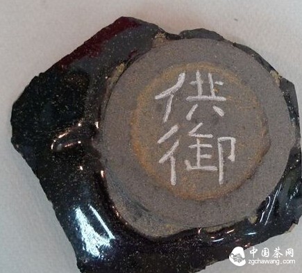 宋建窑乌黑釉黄兔毫盏 口径11.5厘米、底径3.5厘米、高6.4厘米。福建省博物院藏。圆唇,束口,口沿稍外撇,口沿与上腹壁交界处有内凹痕迹。斜弧腹,上腹微鼓,下腹内收。圈足较窄,挖足浅。通体施以乌金釉(即黑釉),夹以棕黄色泽的兔毫斑纹。这种类型的建盏在窑址发掘中所占比例较大,质量较好,应该是典型建窑盏。此类建盏益于斗茶之处有五点:其一,黑釉衬茶。“盏色贵青黑,玉毫条达者为上,取其焕发茶色也”。其二,胎厚保温。“其坯微厚,熁之久热难冷,最为要用”。其三,适合注水。建盏呈斗笠状,水流下注,“底差深而微宽,底深则茶直立,易于取乳”。其四, 形易观汤。斗茶“以水痕先者为负,耐久者为胜”,建盏口沿下部内凹,形成注水线,防止过满,益于托乳。其五,V形设计,稳重大方。品茶时将其放在盏托上,盏身能自动扶正,可避免汤水因茶盏晃动而倾斜。在建窑瓷窑中发现刻有“供御”铭文的碗底残片(图2),均位于窑室中最好的窑位,成品率高,数量较少,说明建窑虽然为民窑,但曾为宫廷烧造过御用瓷器。综合考古发掘及文献记载,此种建盏应是宋代皇帝和文人最为推崇的“建安兔毫盏”。