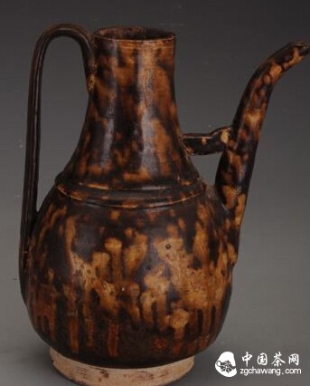 宋吉州窑虎斑纹执壶 口径4.5厘米、足径8.5厘米、高19.5厘米。吉安市博物馆藏。这件执壶为吉州窑黑釉窑变产品,器身布满绚丽的虎斑纹,多彩灿烂。颈部与流之间设一支架,使器物更加固定牢固,又不失美感。