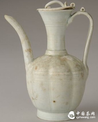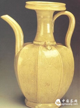 宋龙泉窑执壶 口径7.8厘米、足径7厘米、高19.8厘米。浙江省博物馆藏。浅盘口,细长颈,八棱形鼓腹,八角形圈足,颈腹间装对称的弯曲细长流和扁把,另一面装对称的双耳。腹部刻重瓣蕉叶纹,花饰繁缛,华贵富丽。