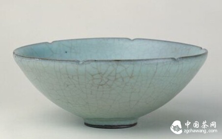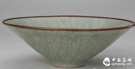 宋官窑葵瓣口碗 口径19.2厘米、足径5.4厘米、高7.9厘米。故宫博物院藏。在宋代,葵瓣口碗是极为流行的造型。此碗釉色莹润,凝厚典雅。釉面布满开片纹,片纹较为密集,口部釉面产生的垂流,把含铁较高的褐紫色胎骨若隐若现地表露出来,圈足刮釉,呈铁色,具有“紫口铁足”的特征。