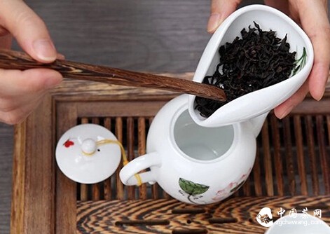 将普洱茶小心置入壶中,置茶用茶匙从茶叶罐中取出茶叶投置入杯壶中;或将茶叶罐中的茶叶先倒人茶荷,再转倒入壶中;或将茶叶缸的茶叶先倒入罐盖,再转倒入壶中。置茶量则根据所品的茶品而定
