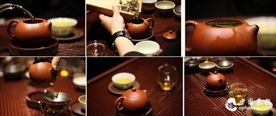 沸水置入壶中,水位为刚浸过茶叶,快速倒去以唤醒茶叶,重复一次。润茶水同时可留在公道杯中,用来淋壶,以保持茶汤的温度,或用来温杯涤具