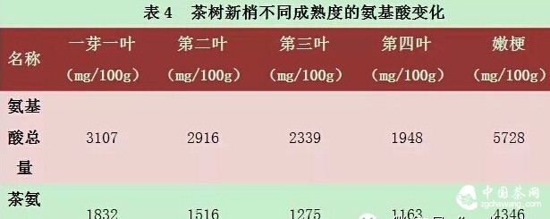 氨基酸是一种重要的滋味物质,在茶汤中起着鲜、甜滋味的主体和调合作用,同时对茶叶香气的形成有着重要影响。嫩梗中的氨基酸含量比芽叶多的多,特别是其中的茶氨酸,嫩梗的含量比芽叶高1-3倍(表4)。这主要是由于茶氨酸在根部合成,经木质部输送到地上部分之后,一部分产生谷氨酸参与茶树氮代谢,另一部分在新梢中积累,所以嫩梗中氨基酸(特别是茶氨酸)含量高。