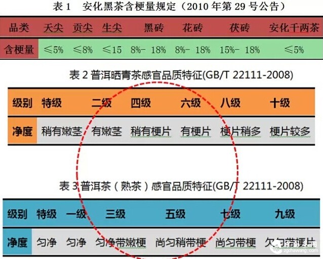 而乌龙茶、普洱茶、黑茶的采摘标准中,都是需要较为成熟的鲜叶,所以在这三类茶里,茶梗的存在是很正常的现象。国家质量监督检验检疫总局公告对于安化黑茶和普洱茶等品类的含梗量有明确的规定: