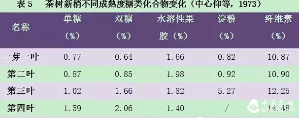 此外,茶梗作为鲜叶的营养传导器官,含有较高的糖分。茶鲜叶中含有很多糖类,除水溶果胶外,成熟叶、茎中几乎有的糖类均比幼嫩芽叶高(表5)。此外,高糖含量是黑茶鲜叶原料的重要生化特性,这是幼嫩芽叶所不能替代的。鲜叶原料这一生化特征,与黑茶品质的甜醇滋味的形成密不可分。