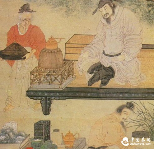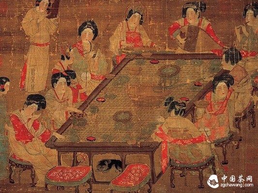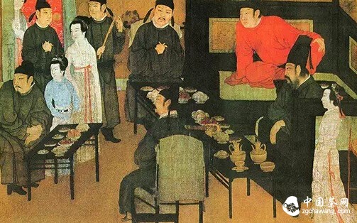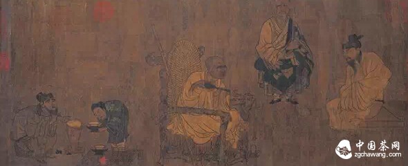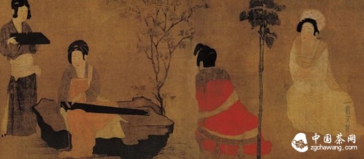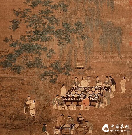 赵佶,即宋徽宗皇帝,1101年即位,在朝29年,轻政重文,一生爱茶,嗜茶成癖,常在宫廷以茶宴请群臣、文人,有时兴至还亲自动手烹茗、斗茶取乐。亲自著有茶书《大观茶论》,致使宋人上下品茶盛行。此画描绘了文人会集的盛大场面。在一个豪华庭院中,设一巨榻,榻上有各种丰盛的菜肴、果品、杯盏等,九文士围坐其旁,神志各异,潇洒自如,或评论,或举杯,或凝坐,侍者们有的端捧杯盘,往来其间,有的在炭火桌边忙于温酒、备茶,其场面气氛烈。