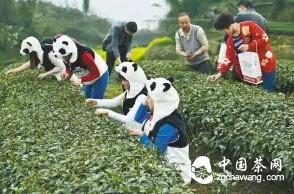 2014年3月12日,四川省雅安市,一群身穿“熊猫衣服”的采茶姑娘在凤鸣山开始了2014年“熊猫茶”春茶采选。这些茶树是从2011年11月起用近10吨熊猫粪便种植出来的。“熊猫茶”中的“稀品”定价近22万元一斤。