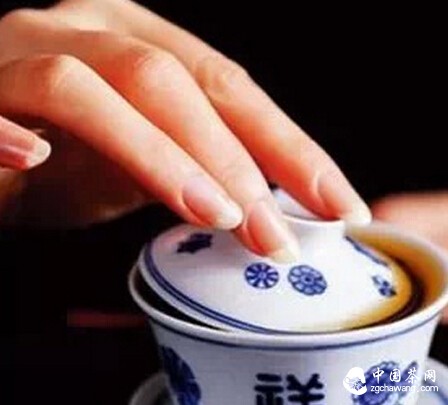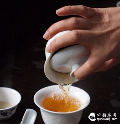 拿盖碗的手势不偏不歪,手指放在口沿上,不要因为怕拿不稳而去捏着杯身。沿着公道杯慢慢向下让茶水缓缓流出。茶水就不会触到手。