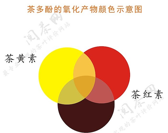 发酵是茶多酚转化的过程,自然的我们想问:茶多酚被氧化减少了以后都变成了些什么物质?按照发酵程度的轻重,茶多酚转变成了茶黄素(TF、亮黄色)、茶红素(TR、深红色)以及茶褐素(TB、暗红色)三大物质。这三种物质不但具有味道,还是茶汤颜色的主要组成物质,也正是由于这个转变的程度不同,我们所喝的茶汤才有了从黄到红、从明到暗的颜色的过渡。