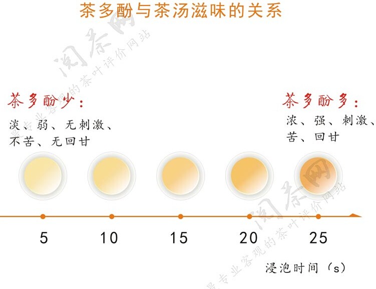 (1)对应于茶汤味道:茶味的浓度、刺激性、收敛性、苦涩与回甘都是由这一类物质引起的。茶汤越浓、刺激越强、收敛性越明显、越苦涩、回甘越好就说明了茶汤中含的茶多酚的浓度越大。