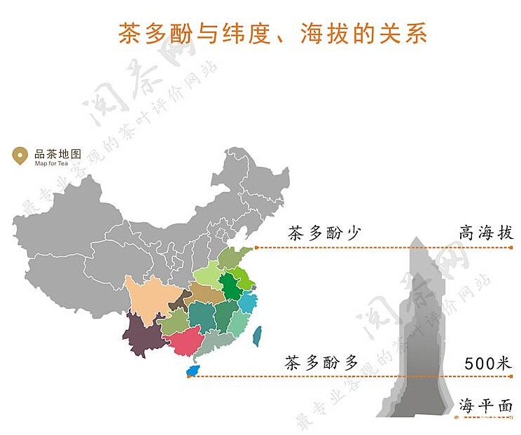 (4)对应于海拔高度:通常而言,在500米海拔往上,相对低海拔所产的茶较高海拔产的茶所含的茶多酚要多;