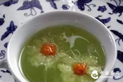 做法:将菊花放入水中煮沸,将榨汁的柠檬和绿豆沙的汁注入菊花水中搅拌,放入少量蜂蜜即可饮用。