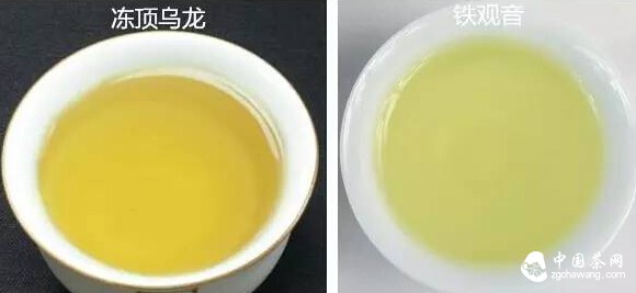 1、观色泽: 铁观音由于发酵程度低及低温保存,色泽砂绿;冻顶乌龙一般发酵程度高,且经过焙火,颜色稍偏黄褐色。