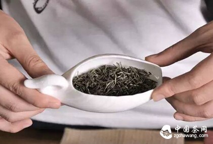 用手拿赏茶荷时,拇指和其余四指捏住茶荷两侧,放在虎口处。另一只手托住茶荷底部。请客人赏茶。