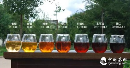 新茶期:黄绿(1-2年)、金黄(3年)、橙黄(3-5年)。