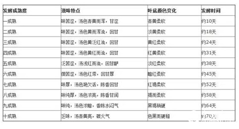 对普洱茶发酵程度的描述,常用“几成熟”来表示。普洱茶渥堆发酵过程中,茶胚的色泽、滋味不断发生变化。不同发酵时间、不同发酵程度的普洱茶,叶底和滋味是截然不同的。普洱茶的“几成熟”,常根据品评滋味、观察叶底来判断。