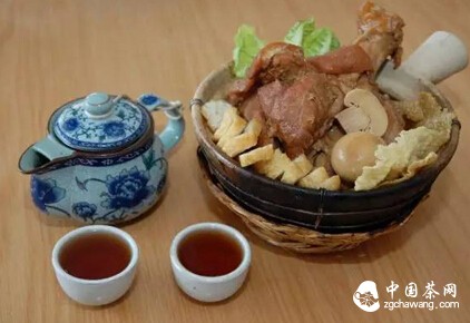 肉骨茶,就是一边吃肉骨,一边喝茶。肉骨,多选用新鲜带瘦肉的排骨,也有用猪蹄、牛肉或鸡肉的。烧制时,肉骨先用作料进行烹调,文火炖熟。有的还会放上党参、枸杞、熟地等滋补名贵药材,使肉骨变得更加清香味美,而且能补气生血,富有营养。而茶叶则大多选自福建产的乌龙茶,如大红袍、铁观音之类。如今,肉骨茶已成为一种大众化的食品。吃肉骨茶时,有一条不成文的规定,就是人们在吃肉骨时,必须饮茶。