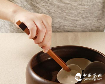 接下来是洁具,这里需要注意的是,干泡法中洗茶杯的方式有2种。一种是直接往摆好的茶杯中冲水,另一种是用茶夹将茶杯夹到水盂上方,进行洁具。