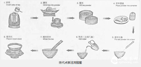宋代饮茶时仍用茶饼,但大多已不再直接烹煮茶叶,称为点茶。点茶时,将已经碾细的茶末直接投入茶碗,然后冲入沸水,略加搅拌后即行饮用。