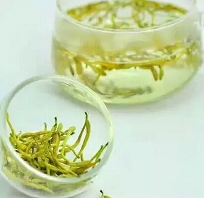 泡饮一般中档金银花茶,不强调观赏茶胚形态,可用洁白瓷器盖杯,冲泡100℃沸水后盖上杯盖,5分钟后闻香气,品茶味。此类金银花茶香气芬芳,茶味醇正,三开有茶味,耐冲泡。