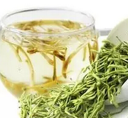 金银花的茎、叶和花都可入药,具有解毒、消炎、杀毒、杀菌、利尿和止痒的作用。金银花露是儿童夏天的防治痱子脓疮的佳品。新鲜的金银花带清香,含水量花蜜较多,农村儿童常采取花朵吸食蜜汁。鲜花茎晒干或按制绿茶的方法制干,即为金银花茶。市场院上的金银花茶有两种,一种是鲜金银花与少量绿茶拼和,按金银花茶窨制工艺窨制而成的金银花茶;另一种是用烘干或晒干的金银花干与绿茶拼和而成。这两种金银花茶,前者花香扑,以品赏花香为主;后者茶香味较低,但可保持金银花的药效作用,不失其保健效果。金银花茶是老少皆宜的保健饮料,待别是夏天饮用更为适宜。