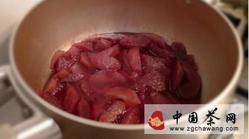 ⑵步骤:将苹果切成厚约2厘米的瓣,放入小锅,倒入醒好的红酒,浸没果瓣。小火微炖至沸腾后关火。开盖,放置温凉(在此期间,苹果会变成红色哦);