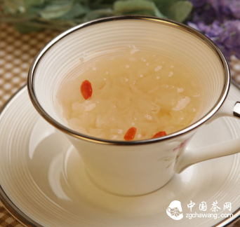 可选用银耳20克、茶叶5克、冰糖20克,先将银耳洗净加水与冰糖炖熟,再将茶叶泡5分钟后加入银耳汤里,搅拌均匀服用。