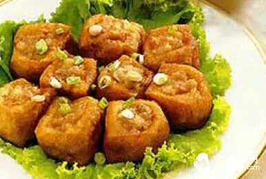 5、热锅,倒入适量的油烧热至180℃时,放入作法4的豆腐,炸至外观呈金黄色时捞起沥油即可。