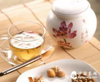 原料:枸杞5g、五味子3g、龙胆草3g、虎杖3g、绿茶5g、冰糖10g。