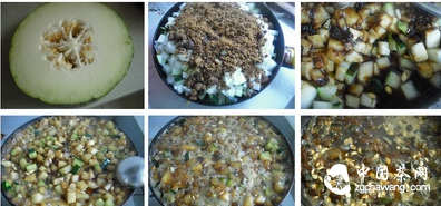 1、冬瓜洗净,连外皮、冬瓜籽、冬瓜蓉一起,切成小丁;