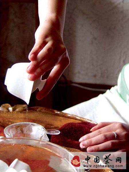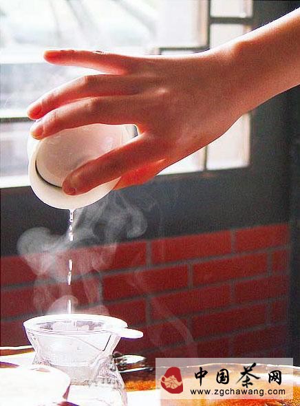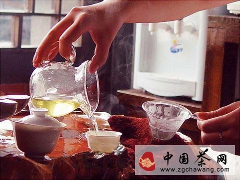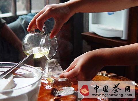 孟臣沐霖:即烫洗茶壶。孟臣是明代紫砂壶制作家,后人把名茶壶喻为孟臣。第一泡茶迅速洗茶,用滚烫的茶水洗涤茶具,意在消毒,所用器件要求不能沾手,以免手上汗水玷污茶具。