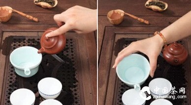 把沸水再次倒入壶中,倒水过程中壶嘴“点头”三次,别一次把壶倒满,茶道的程序其实也只是好看而已,只有这步才是平时大家常用的,表演上有即所谓“凤凰三点头”,向客人示敬。