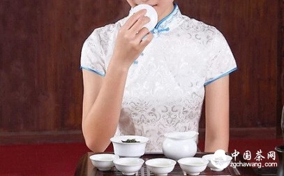 这个是客人开始独自感悟的步骤,客人将茶汤倒入品茶杯,轻嗅闻香杯中的余香,最好能有陶醉状,表示对主人茶的欣赏和赞叹。