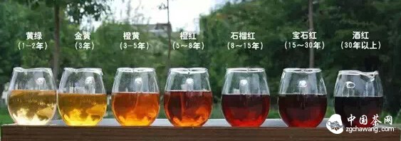 新茶期:黄绿(1-2年)、金黄(3年)、橙黄(3-5年)。