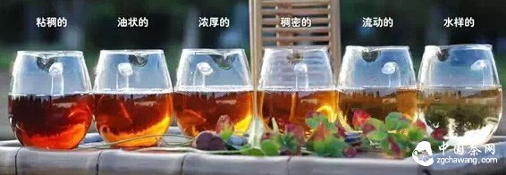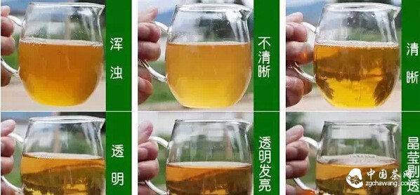 由于茶汤中的茶多酚与空气接触会很快氧化,以致茶汤容易变色,因而要及时欣赏汤色,主要从色度、亮度、清浊度等方面,辨别茶汤颜色深浅、正常与否、茶汤暗明、清澈或浑浊程度。