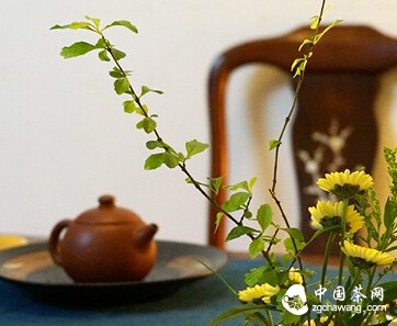 插花在茶席上的应用,它可以协助主人达到茶席所要表达的意境。但现在所要说的是以插花为主要手段,表现了主人所要达到的任务,这时的插花不能只是站立在一旁观看,而是要进入到泡茶席的核心区,与茶具一起共舞。