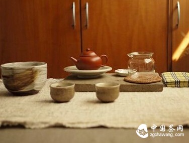 当然也可以利用桌巾或桌面的处理来加强茶具的视觉效果,如桌子与茶具都是深色或都是浅色,就可以利用桌巾的颜色将茶具突显出来,如茶席是利用捆绑花枝的粗草席作为桌巾铺在桌面,再置上粗放的手拉坯茶具。一幅随兴、不修边幅的画面。