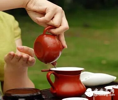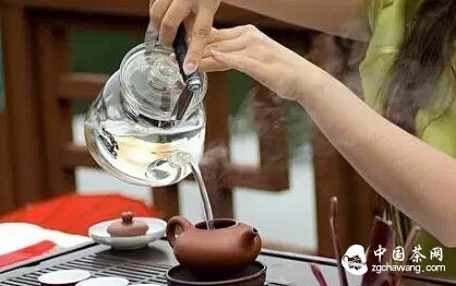 “重洗仙颜”本是武夷九曲溪畔的一处摩崖石刻,在这里意喻为第二次冲水。第二次冲水不仅要将开水注满紫砂壶,而且在加盖后还要用开水浇淋壶的外部,这样内外加温,有利于茶香的散发。