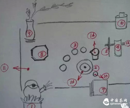 (我太久没教/使用基础席,画完图编完号,一看,怎么才12个物件,明明该有13个?心想大概是壶承吧,所以就加画一圈,凑13。但觉得以前教,好像没把壶承当那么重要。打字时明白是少了匀杯,哈,可是没时间重画,那就从此14呗。壶承其实应给予重视,泡茶器有了它,价值感提升,让整个席的主客关系更清楚,因而茶席更稳定)。