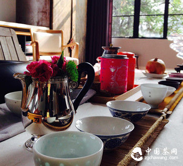 古朴幽雅的传统茶器,古典摩登的银器,在茶桌上进行着文化的碰撞。红色茶罐与鲜红的花朵,成为桌上一抹红,宛如一个热情活力的姑娘。