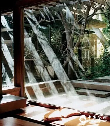 这间茶室的作者和位置榜叔都不甚清楚,只是被这样暖心又悠然的设计打动了。设计师应该是个崇尚自然生活的人。几乎整面墙都做成落地玻璃窗,通过天顶木栏的独特设计,让阳光像水一样从天顶倾斜下来,直接铺洒到房间地板和屋外的阳台上。