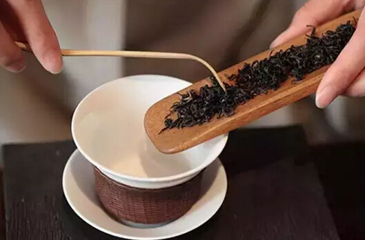 需要用到茶道组中的茶匙,将茶叶分到冲泡器皿。可根据喝茶的人数和口味来酌情加减投茶。