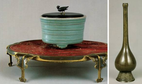 最高级的唐物茶道具—龙泉窑青瓷香炉,唐铜鹤首花瓶