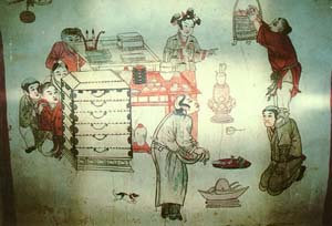 1993年,河北省张家口市宣化区下八里村7号辽墓出土了一副壁画——《童嬉图》。画右有四个人物,四人中间放置茶碾一只,似为铁铸,船形碾槽中有一砣轴;旁边有一黑皮朱里圆形漆盘,盘内置曲柄锯子、毛刷和绿色茶碾;盘的上方置茶炉,分炉座和炉身,炉身下开一荷形火门,炉口上坐一执壶。器物四周的人,一为着契丹装的男童,作跪式,双手扶膝,用力支撑状;其肩上站一女童,双手伸向高挂的盛满桃子的竹篮;另有一男童正双手撩起衣袍前襟,兜内盛满桃子;有一年轻美貌女子,装饰美丽,似为主人,左手扬起,右手指向取桃女童,揣其意似在申斥:为何碾茶童不碾茶,煮水女不扇炉!