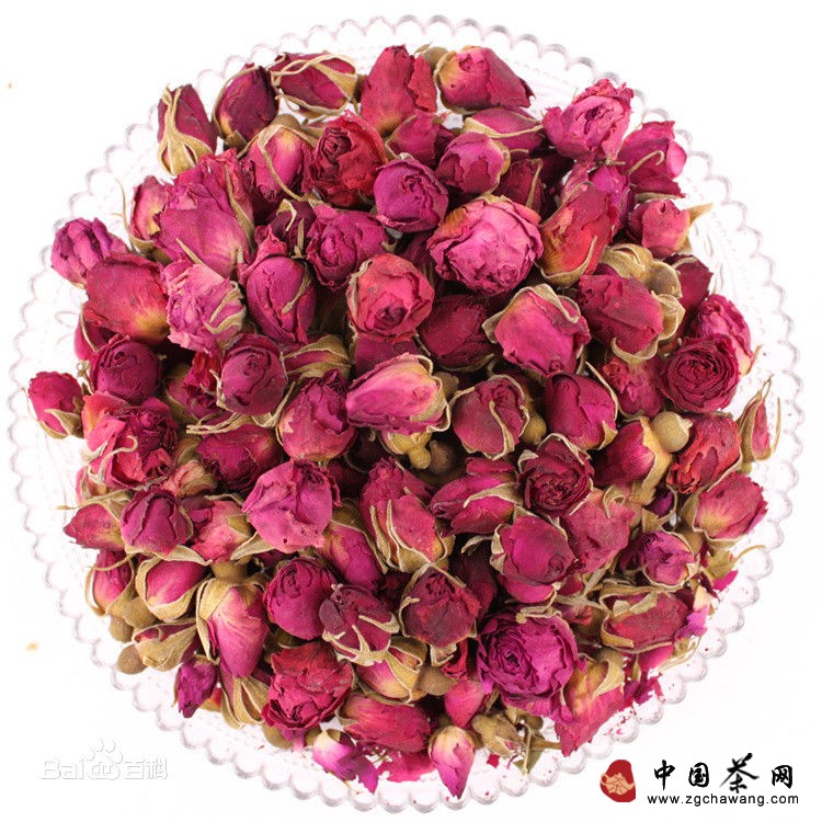 玫瑰(R rugosa):落叶灌木,茎密生锐刺,羽状复叶,小叶5-9片,椭圆形成倒卵圆 形,上面有皱纹,夏季开花,花单生,紫生色至白色,有浓郁芳香,花及根可入药,有理气活血、收敛作用。玫瑰窨制花茶,早在我国明代钱椿年编、顾元庆校的《茶谱》中就有详细记载。我国现今生产的玫瑰花茶主要有玫瑰红茶、玫瑰绿茶、墨红红茶、玫瑰九曲红梅等花色品种。玫瑰花采下后,经适当摊放,折瓣,拣去花蒂、花蕊,以净花瓣付窨。广东玫瑰红茶实行单窨,下花量为100公斤茶用10-16公斤花;福建玫瑰绿茶两窨一提,总下花量为100公斤茶用50公斤花;九曲红梅一窨一提,用花量为20公斤。