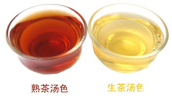 生茶的茶汤以黄绿、青黄、金黄色为主,好的陈年生茶的汤色一般橙黄明亮。熟茶发酵度轻者多为栗红色,发酵度重者以暗红色为主。